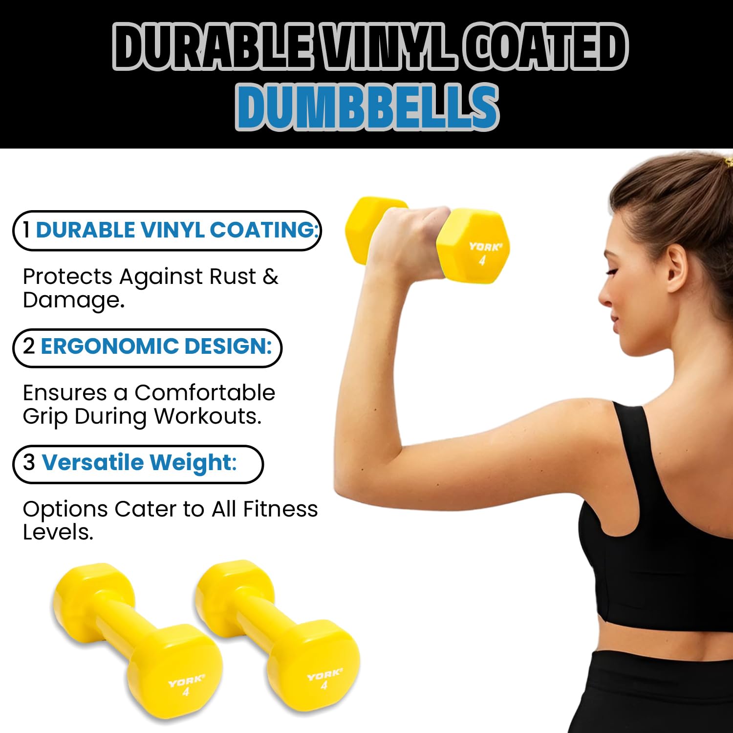 York Barbell Vinyl Coated Fitbell Dumbbell (4LB, Pack of 1) | Durable Anti-Roll Anti-Slip, Color Yellow | Ideal for Arm Rows Squats Chest Presses Bicep Curls Walking Jogging & Yoga